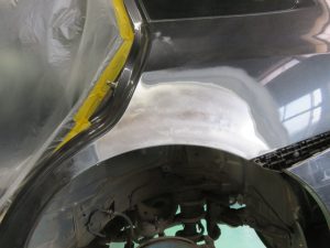 リヤフェンダーの鈑金。プレスラインを再現しながら鉄板に「張り」を持たせます。